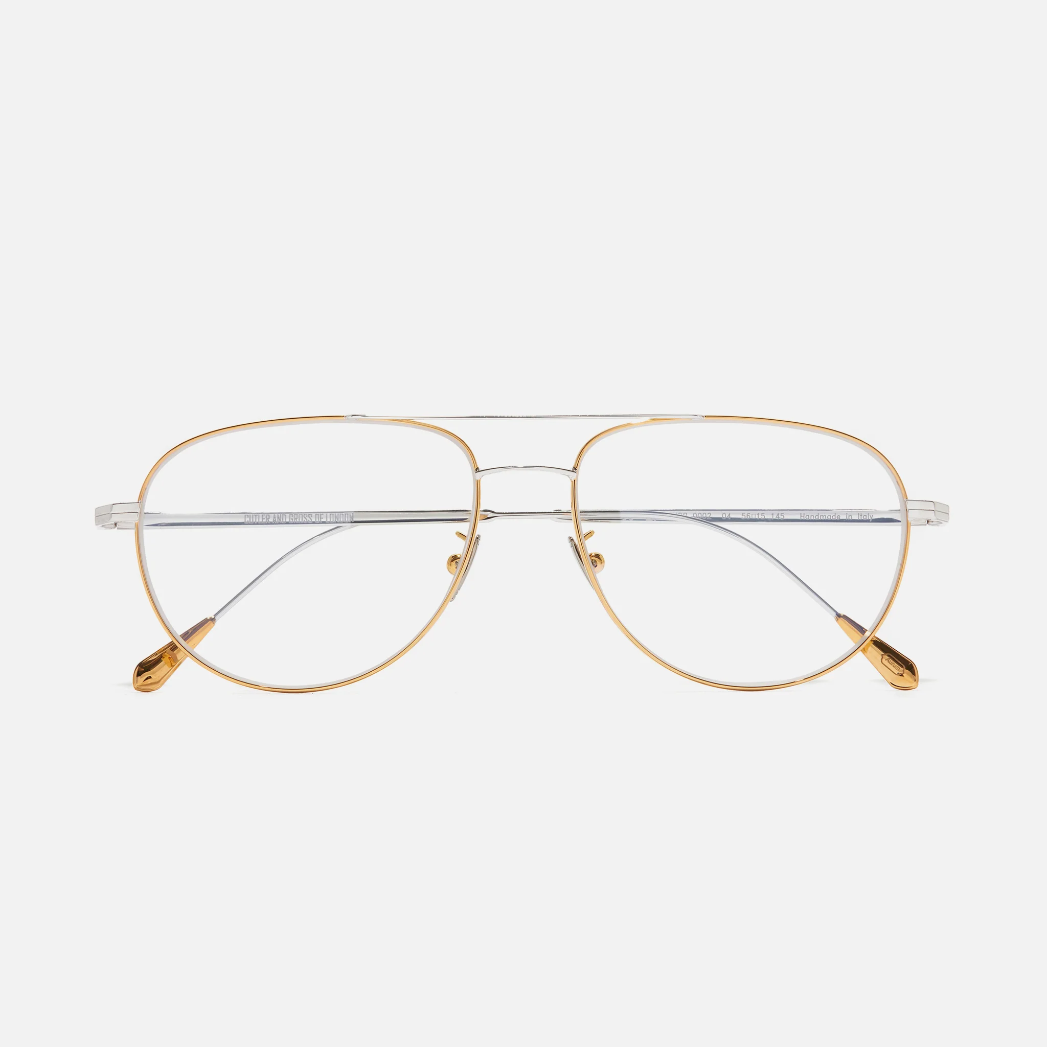 The 0002 is an undersized aviator frame with a distinctly refined character, crafted in either 18K White Gold Rhodium, 18K Gold, 18K Rose Gold, or a combination of precious metals Yellow Gold 24K + Rhodium 18K.