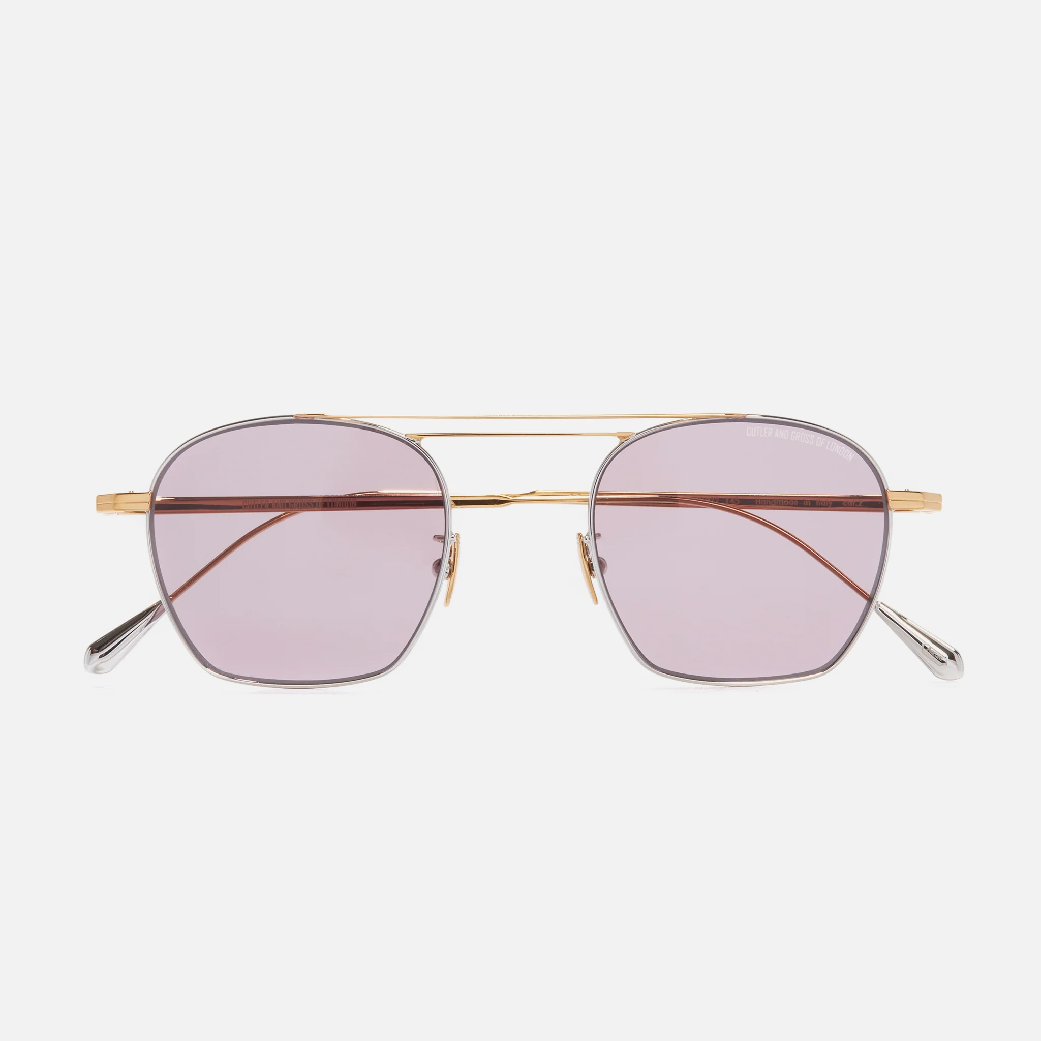 The 0004 sunglass presents a subtle update on the classic navigator frame, sculpted with octagonal edges and a double browline. It's handcrafted in Italy from polished precious metals to an ultra-light design. Available in 18K White Gold Rhodium, 18K Gold, 18K Rose Gold, and a combination of 24K Yellow Gold and 18K Rhodium.