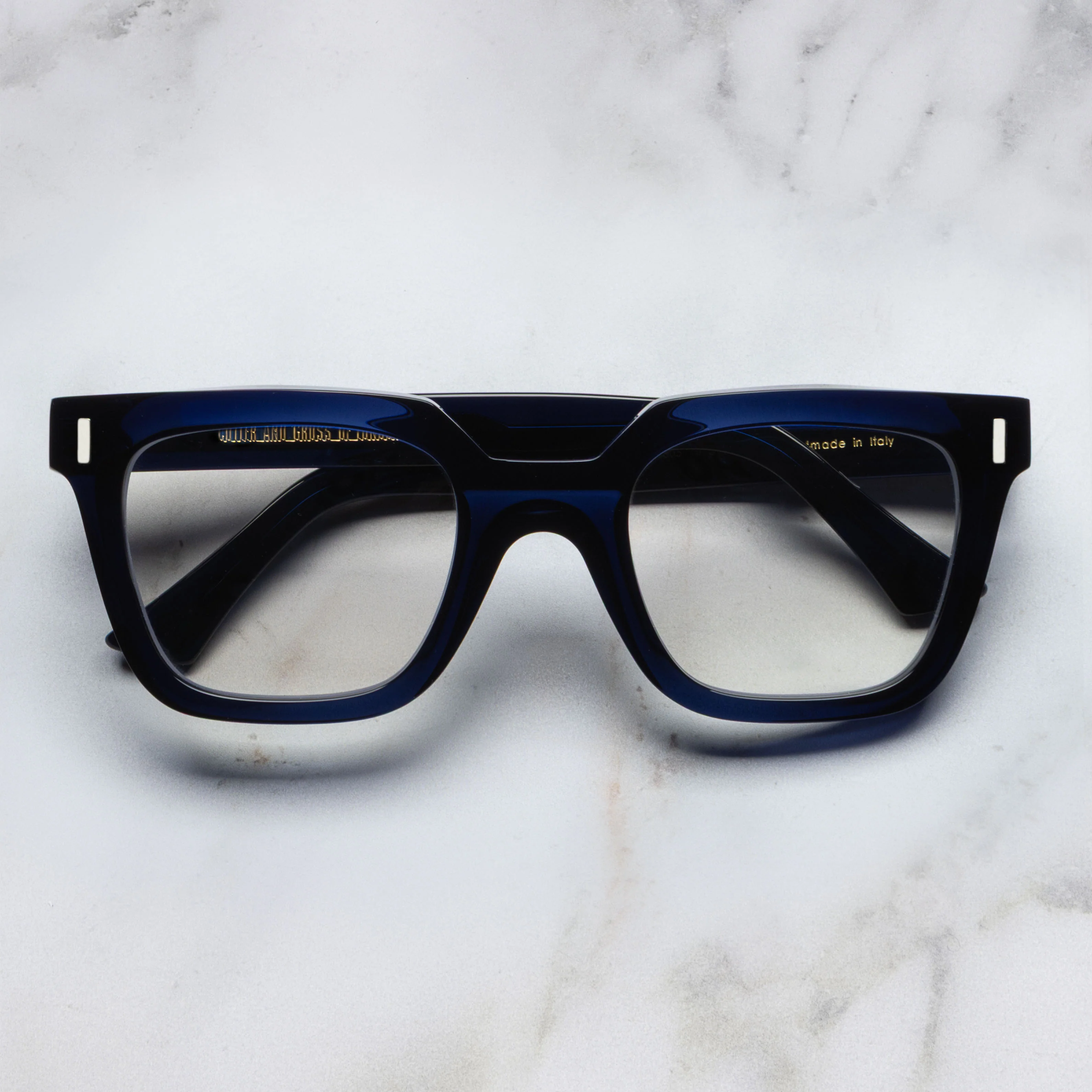 Clean-cut Bullion pins and Fretboard core wire—Cutler and Gross motifs—gild the front of this striking square optical. It comes meticulously handcrafted by Cutler and Gross artisans in Italy from 9mm-thick acetate and lightened with interior bevelling.
