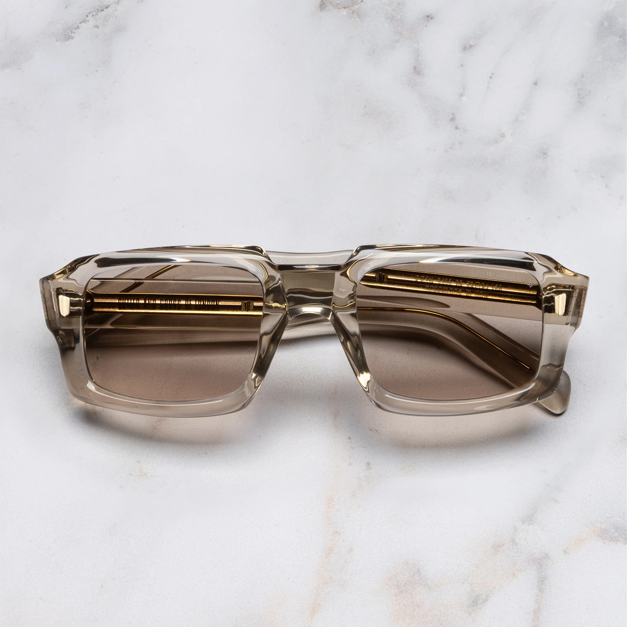Shaped to a curved 6-base silhouette, this sunglass required our artisans to unearth specialist techniques from the 60s. The determined, blocky profile has been cut away at the browbar and chamfered with tilted edges. Detailed inside and out, the frame has been intricately milled around the lenses.