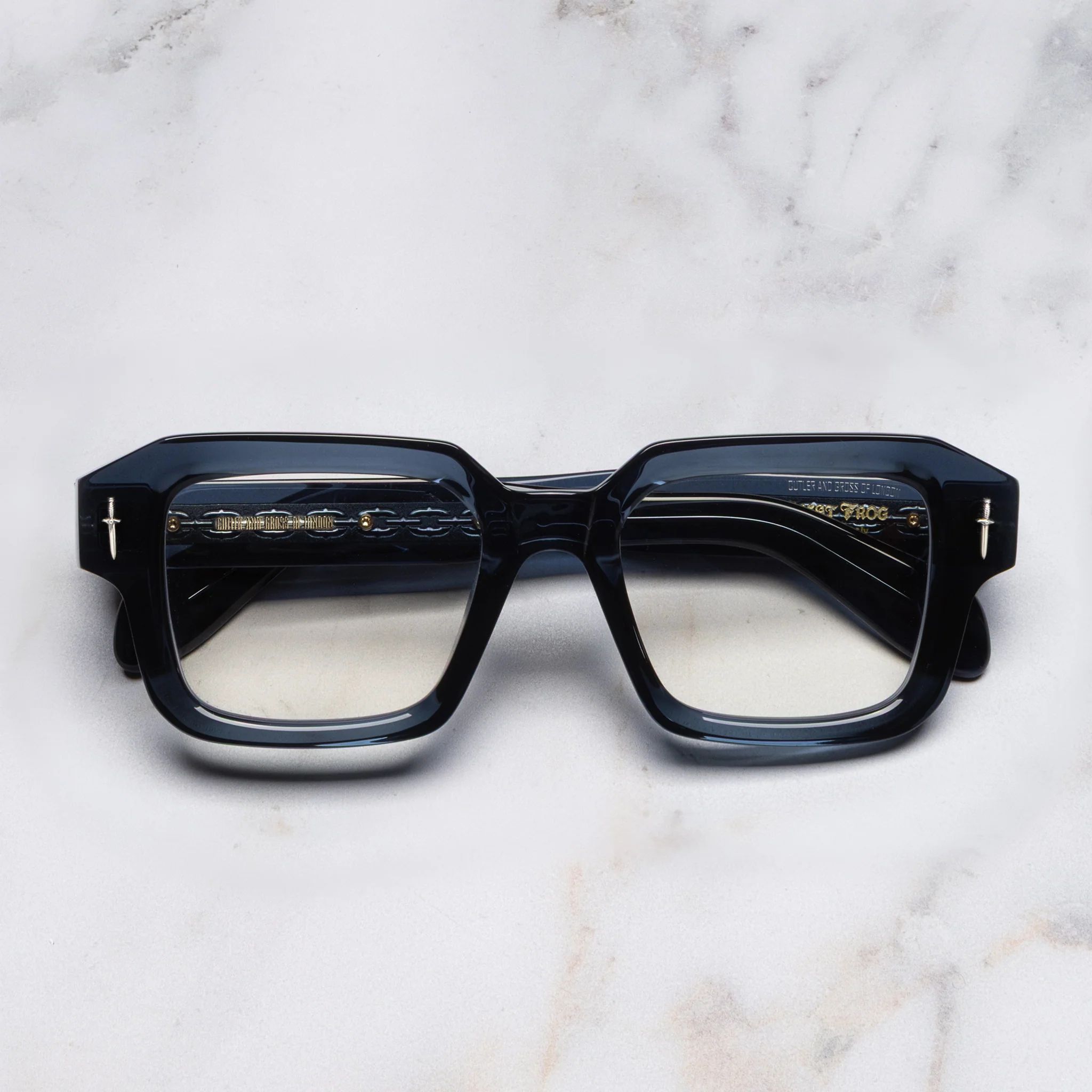 The Great Frog's rock'n'roll jewellery meets Cutler and Gross's acetate artistry with these square glasses. Hand cast in Sterling Silver, Bones Link and Dagger emblems gild the temples and frontal. The clean-cut shape is reverse-milled and threaded with Lock Down chain core wire.