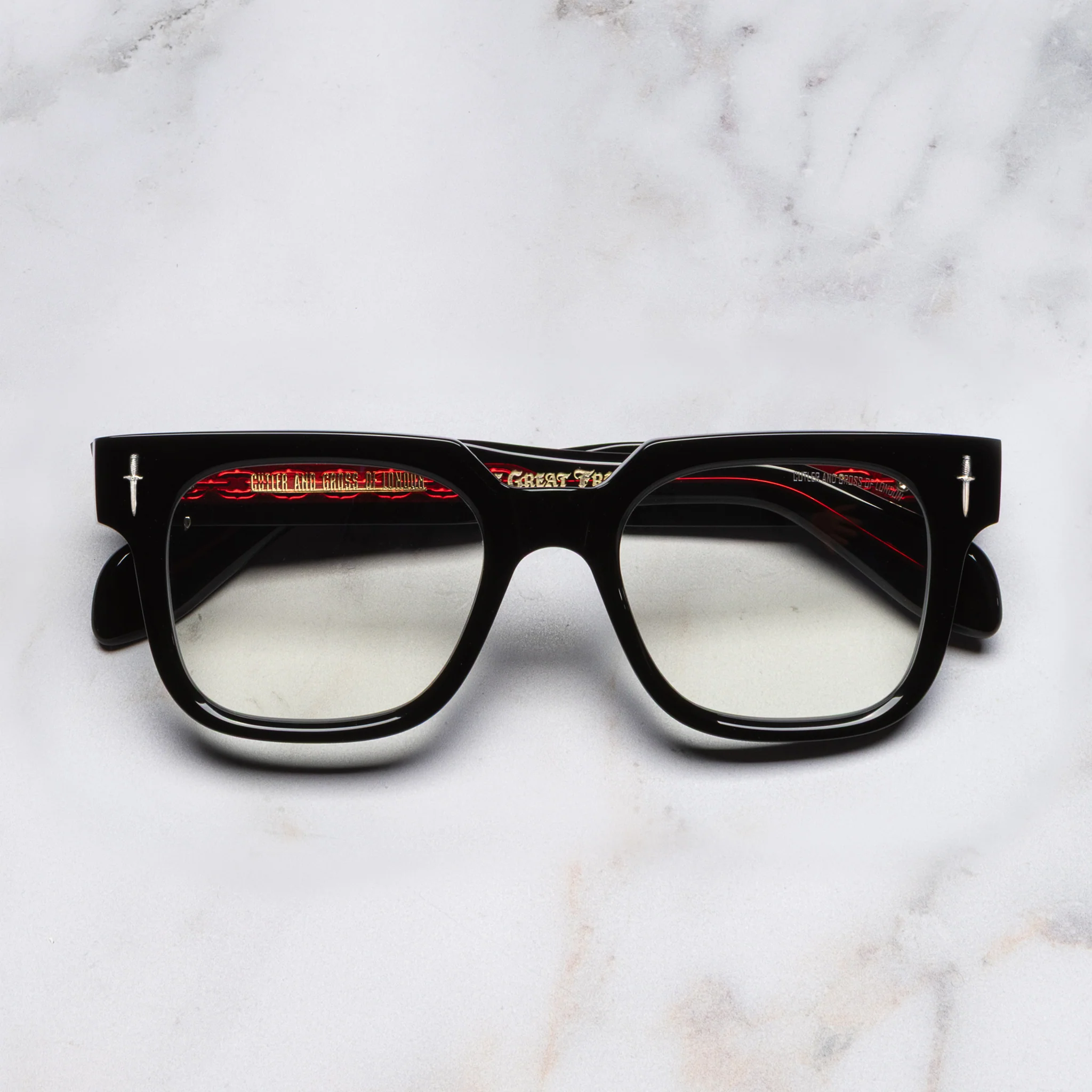 The Great Frog's anarchic vision takes these square glasses into bolder territory. They're detailed with Dagger and Lucky Diamond emblems, which are cast from Sterling Silver by a jeweller in Vicenza. The frame is crafted using weight-saving reverse-milling and structured with custom Lock Down chain core wire.