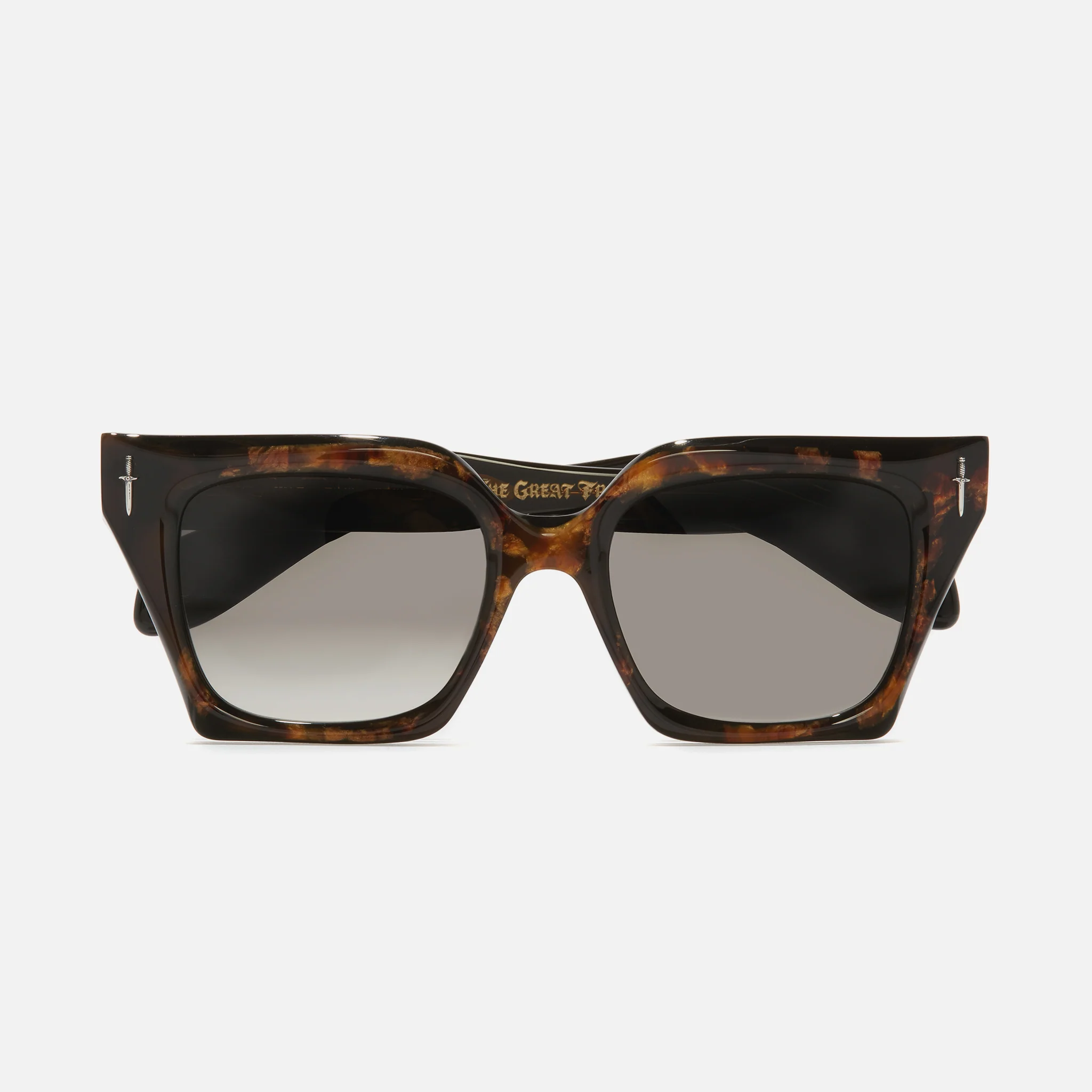 This Cutler and Gross X The Great Frog sunglass is handcarved to a faceted profile with up-swept lugs that mirror licking flames. Created in collaboration with rock'n'roll jeweller The Great Frog, the antagonistic frame is gilded with Dagger pins.